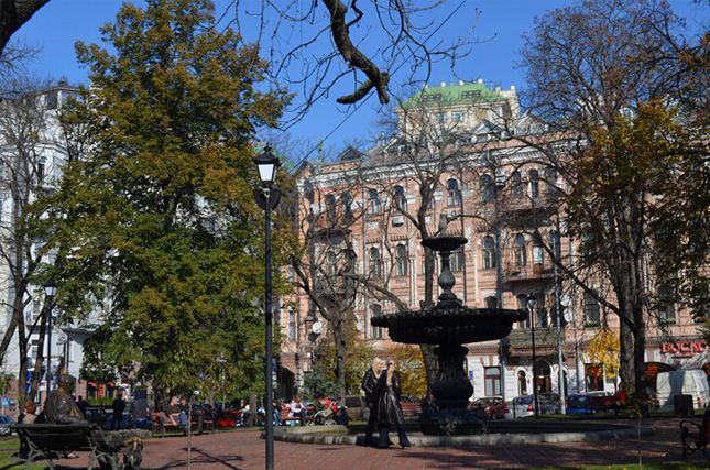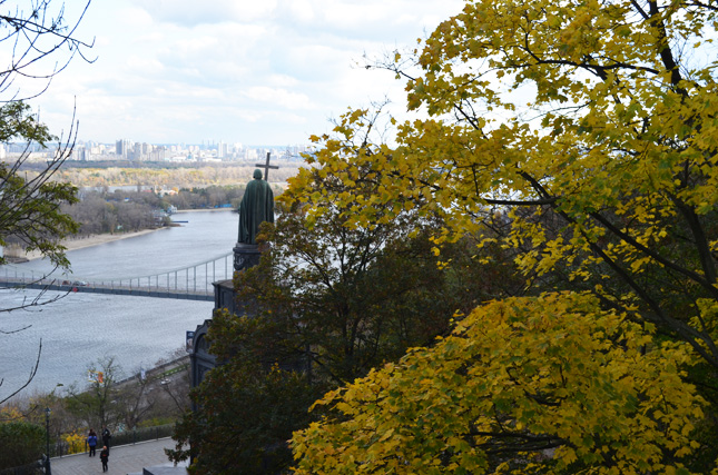 Volodymyrska Hirka descends to embankment and continues into Mariinskyi Park. A bridge over the precipice, 17th century Mariinsky palace built for Russian Emperors, numerous sightseeing places and monuments are encountered here. One of them is Eternal Love monument, dedicated to amazing story of love between ukrainian woman and italian soldier during WW2.